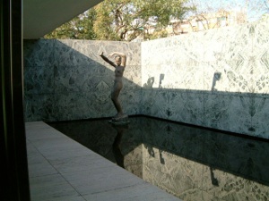 Matériaux luxueux (marbres, travertin, etc.), horizontalité partout, surfaces planes qui font miroir et décuplent la lumière à l’intérieur avec cette eau immobile sur fond sombre, protégée des vents. Meubles épurés conçus pour l’exposition.